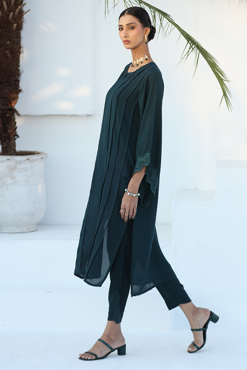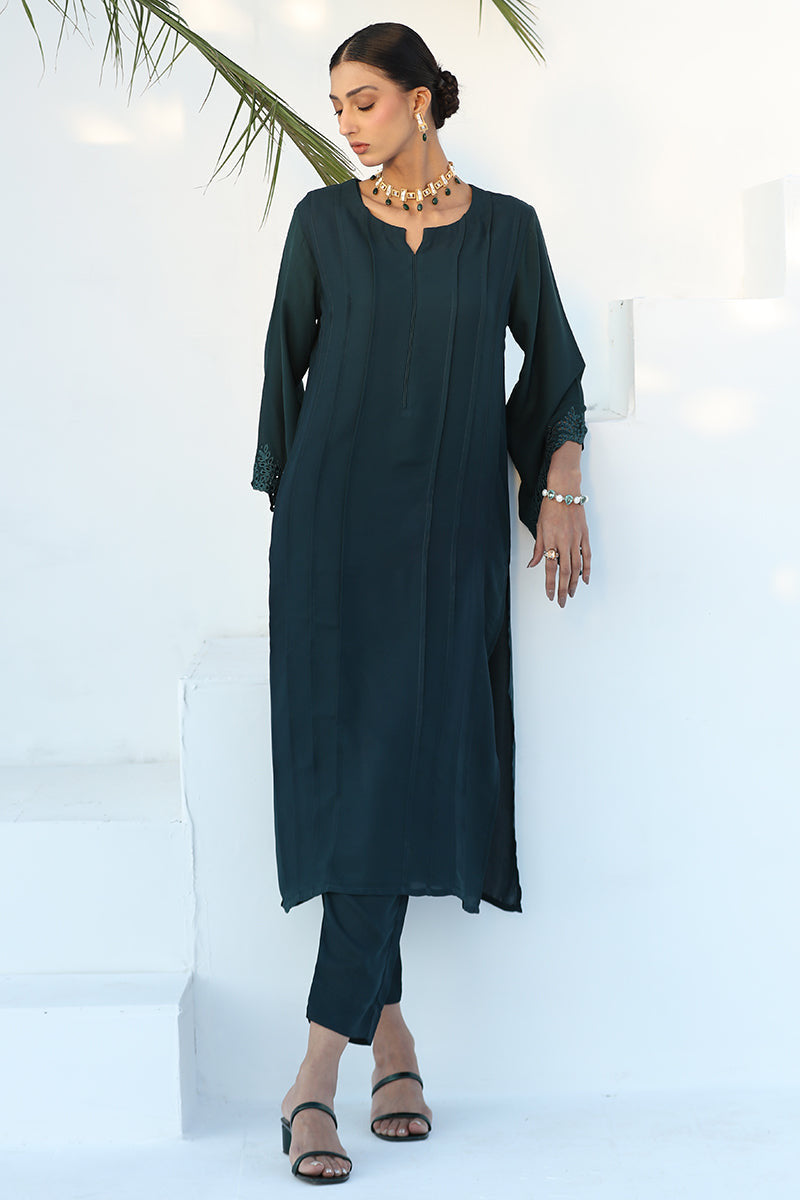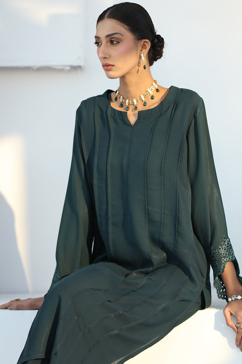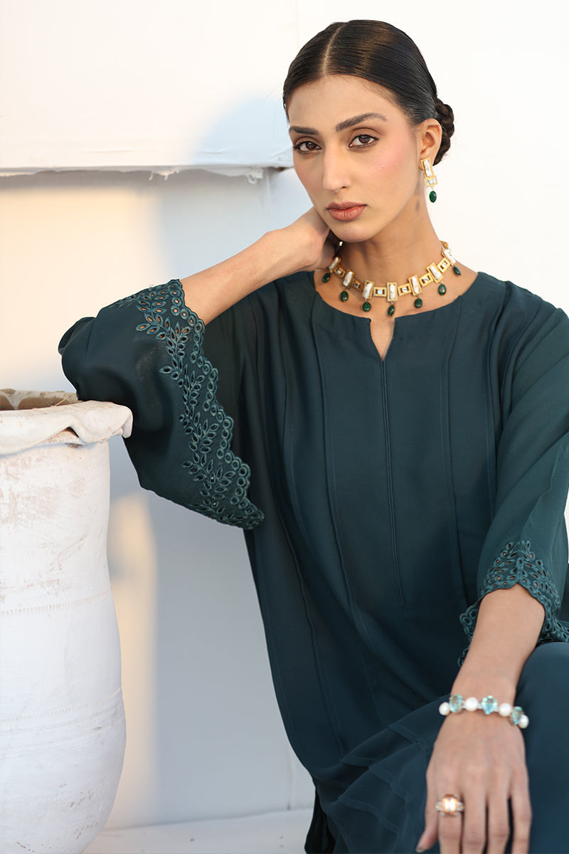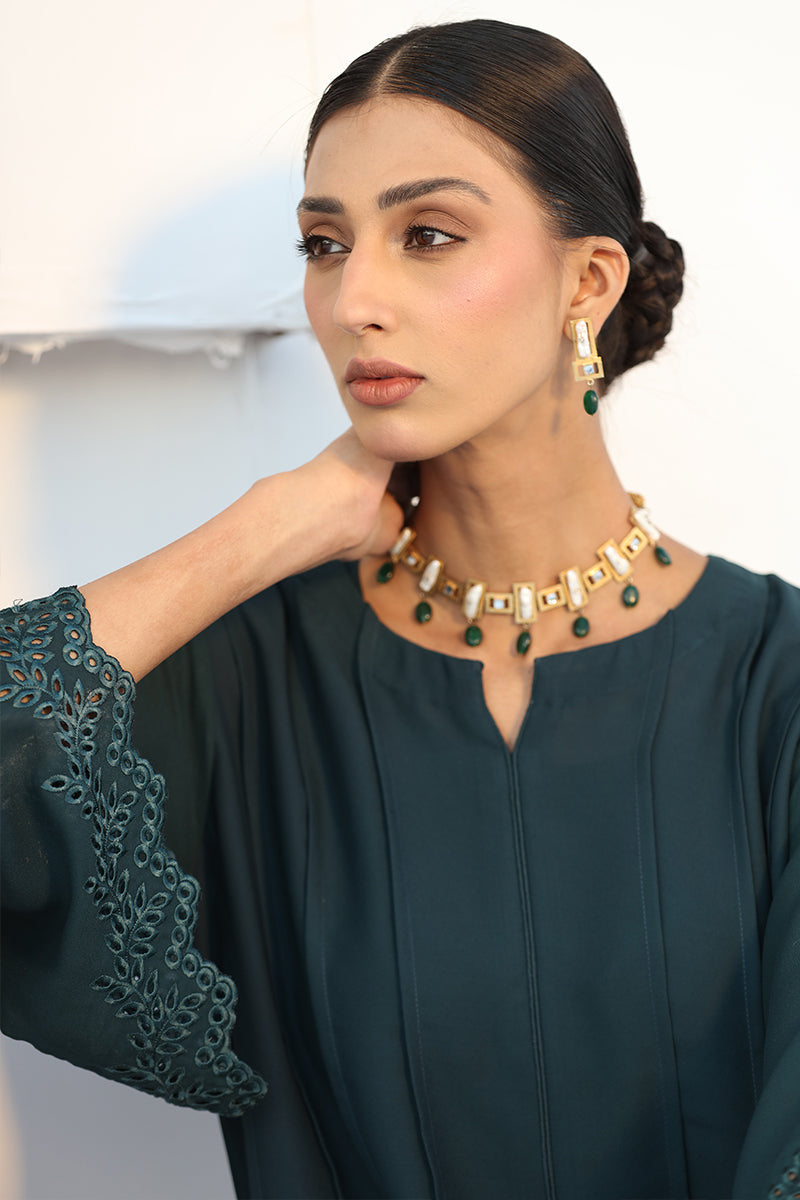 An opulent opal green piece, featuring exquisite pleats in the front that add a touch of refinement and create a flattering silhouette. The wide embroidered sleeves with intricate embroidery details elevate this articles elegance.